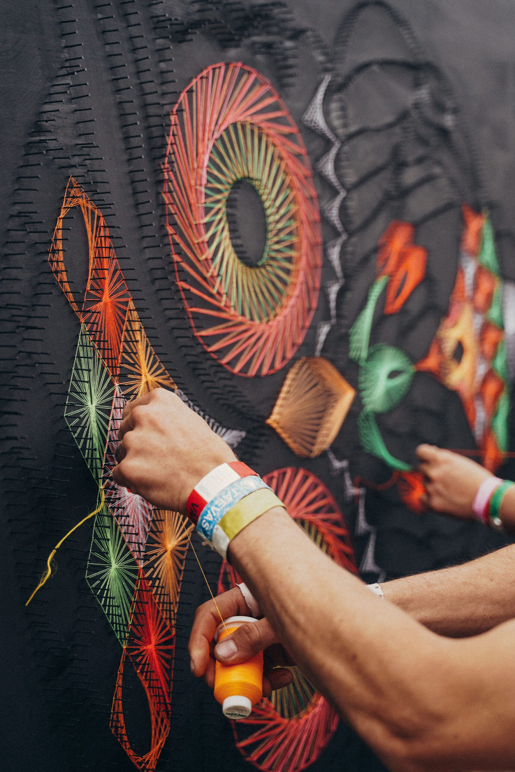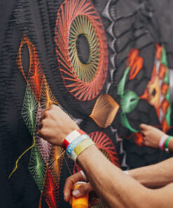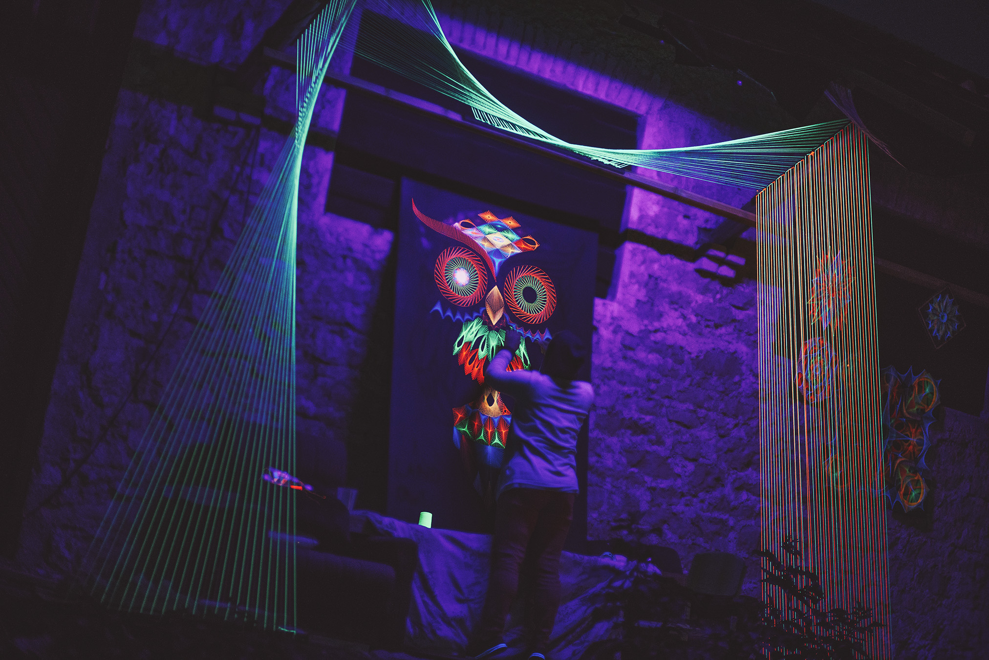 Materjal: Mustaks värvitud vineer, millele on käsitsi punutud UV-aktiivne neoonniit.